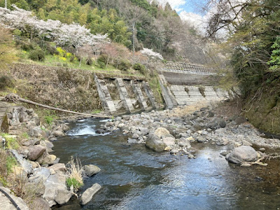 視線を岩壁から外へ向けることもできるようになり、露天風呂としての景色を楽しんだり。下の写真は帰り際に風呂から離れた場所まで来てから撮ったもので、洞窟風呂でもこれに近い景色が見える。桜と菜の花の組み合わせがいい感じだった。